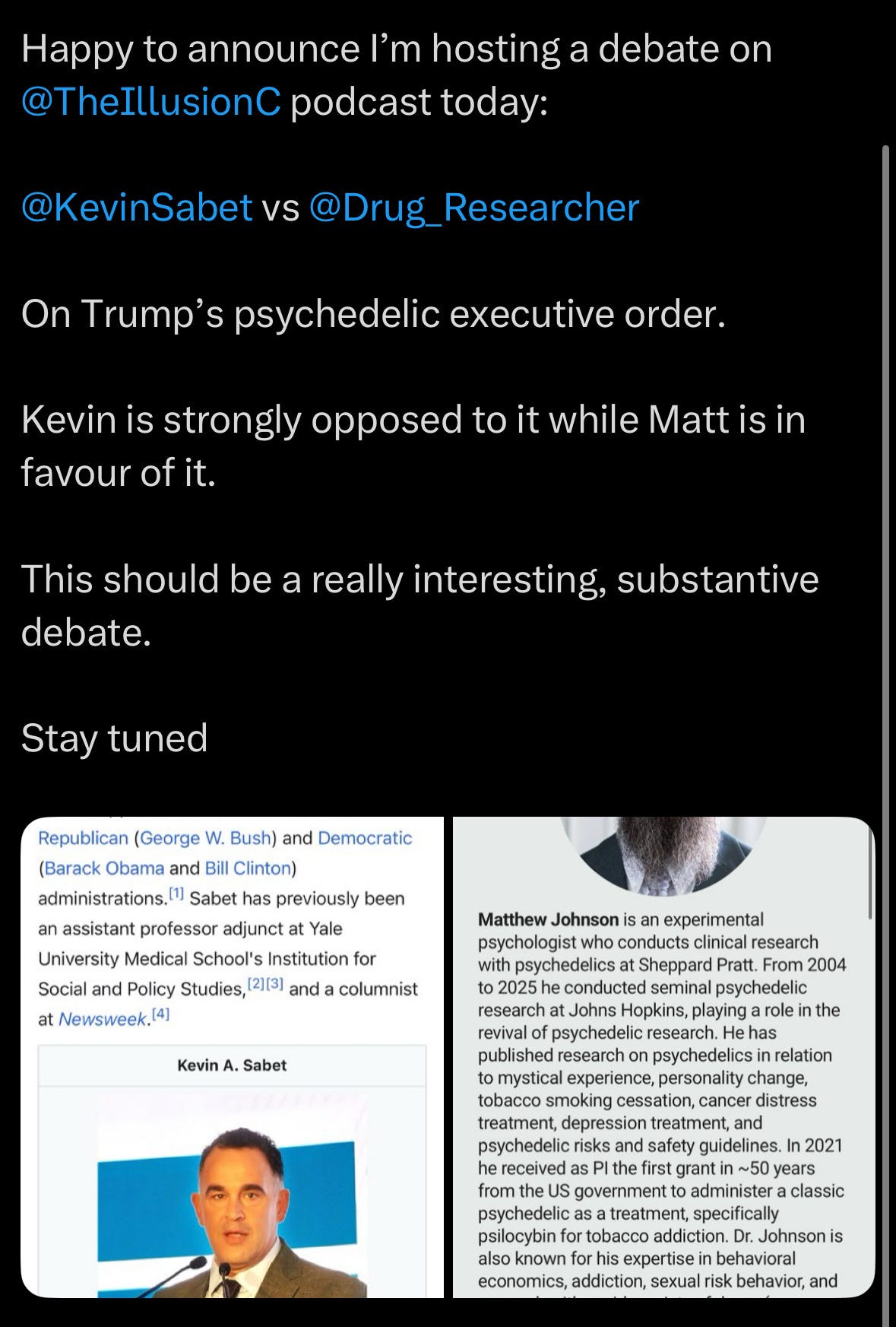 As I just announced on X, two heavyweights in the drug policy space have agreed to come on the podcast to debate Trump’s new psychedelic executive order: